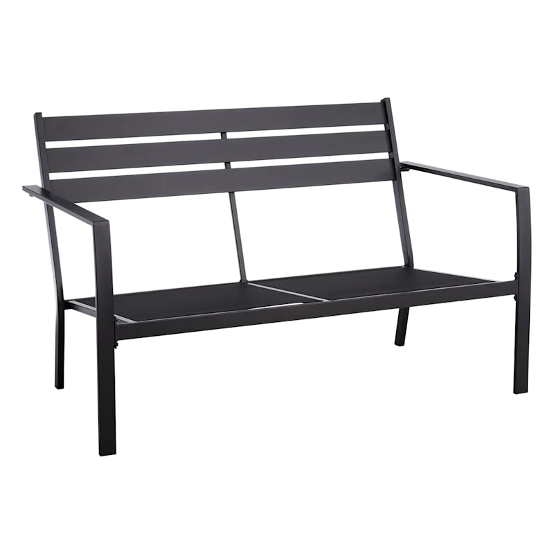 Finish out your outdoor dining arrangement or create a casual seating space with our black Grammercy steel slat outdoor loveseat. Designed to live outdoors, this chair is perfect for weathering the elements with its painted steel finish. Understated and featuring a slatted design, this loveseat will go anywhere. For convenience you can stack and put away when not in use.
