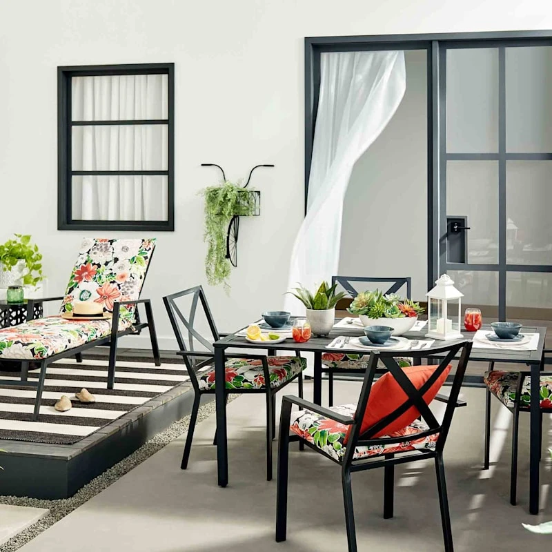 Our sleek black Grammercy outdoor dining table will add a bold design aesthetic to your patio or deck. Constructed of powder coated steel, it has a decorative, durable, corrosion-resistant finish that will stand up to elements and provide years of outdoor entertaining enjoyment. The slatted top allows water to seep through so it doesn�t collect on the top. Add a pop of color with a patio umbrella that fits through the hole right in the middle of the table.