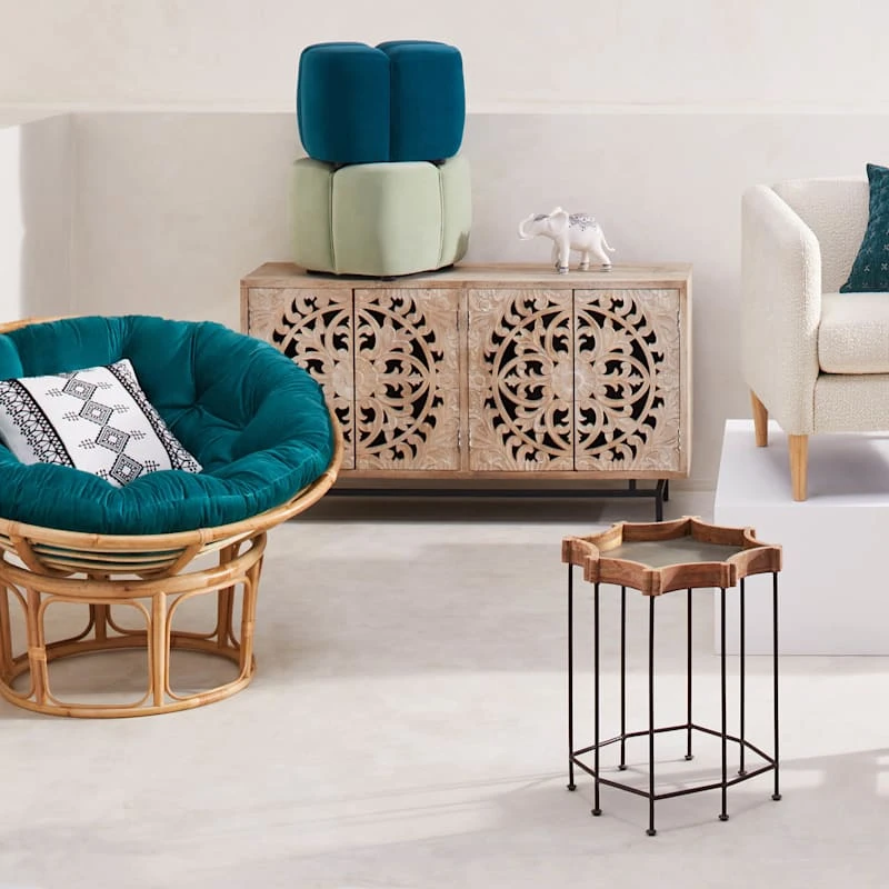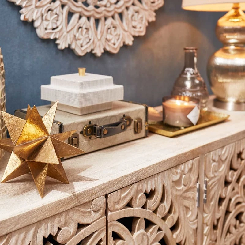 Found & Fable is a new collection that lets you explore what’s right around the corner. Choose your own adventure every day. Savor it all and say yes to what comes next—exclusively At Home. Add an exotic accent to your living room, dining room, bedroom, or kitchen with our carved 4-door sideboard. Crafted from wood and metal, this piece features carved unique designs on its panel doors and distressed weathering for an antique look. Doors open up to reveal an interior shelf and space for books, dishes, and other personal items. It’s not only an accent cabinet but also a unique designed piece of artwork to decorate your house.