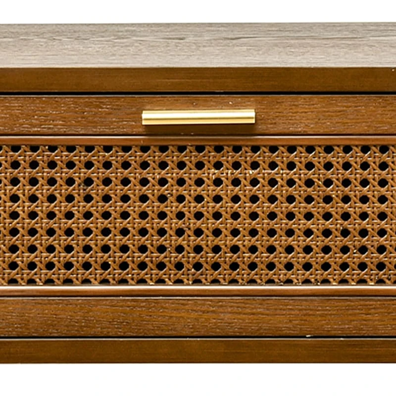 Explore what’s right around the corner. Choose your own adventure every day. Savor it all and say yes to what comes next. Found & Fable is a new collection only found at At Home. Our Reston round corner wood console table has a large drawer with rattan on the drawer front for decoration and added charm. The large volume of the drawer on this occasional table is perfect for storing all kinds of accessories and convenient to open and close. The walnut finish on this elongated table is a perfect match to the home with warm farmhouse style.