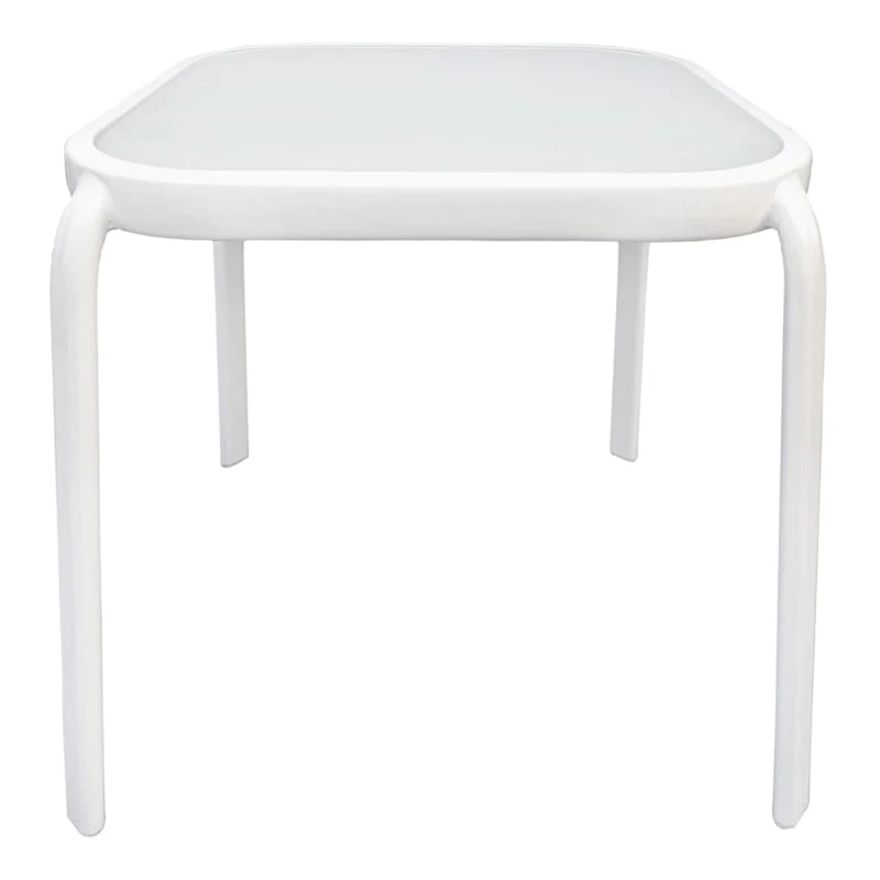 Streamlined with just a touch of retro, our white steel outdoor patio end table exudes simple contemporary design. Crafted of painted metal with a tempered glass top, this side table strikes a clean-lined square silhouette on four straight legs. This table will provide a perfect platform for drinks and nibbles at your next backyard bash.
