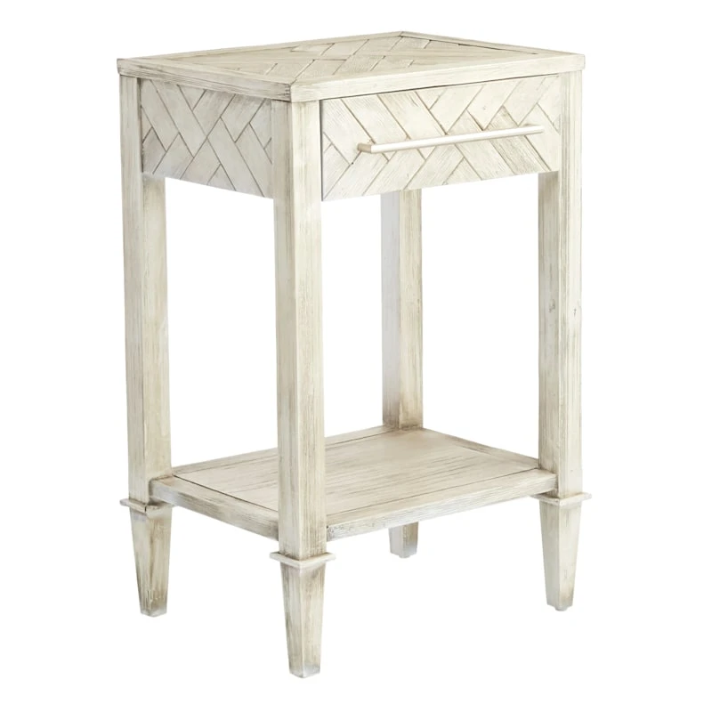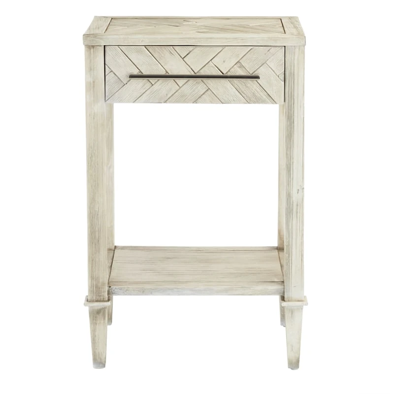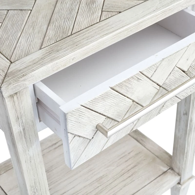 Our beautiful Kate Parquet side table has a whitewashed distressed finish and is perfect to showcase in any bedroom or next to your favorite chair in the living room. To keep the genuine rustic look the front drawer features an interesting basketweave, parquet look that matches the top. The modern bar pull on the drawer adds to the character of this one-of-a-kind piece and makes it a contender for both modern or farmhouse settings.