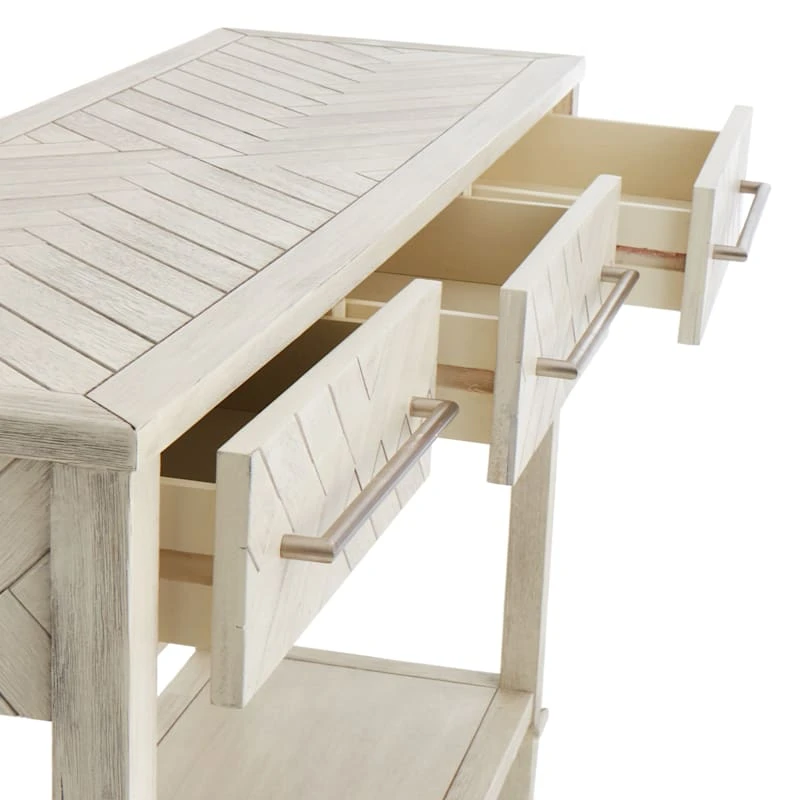 Our beautiful Kate Parquet console has a whitewashed distressed finish and is perfect to showcase in any entryway or behind a sofa. To keep the genuine rustic look, the three front drawers feature an interesting basketweave parquet look that matches the top. The modern bar pulls on the drawers add to the character of this one-of-a-kind piece and make it a contender for both modern and farmhouse settings.