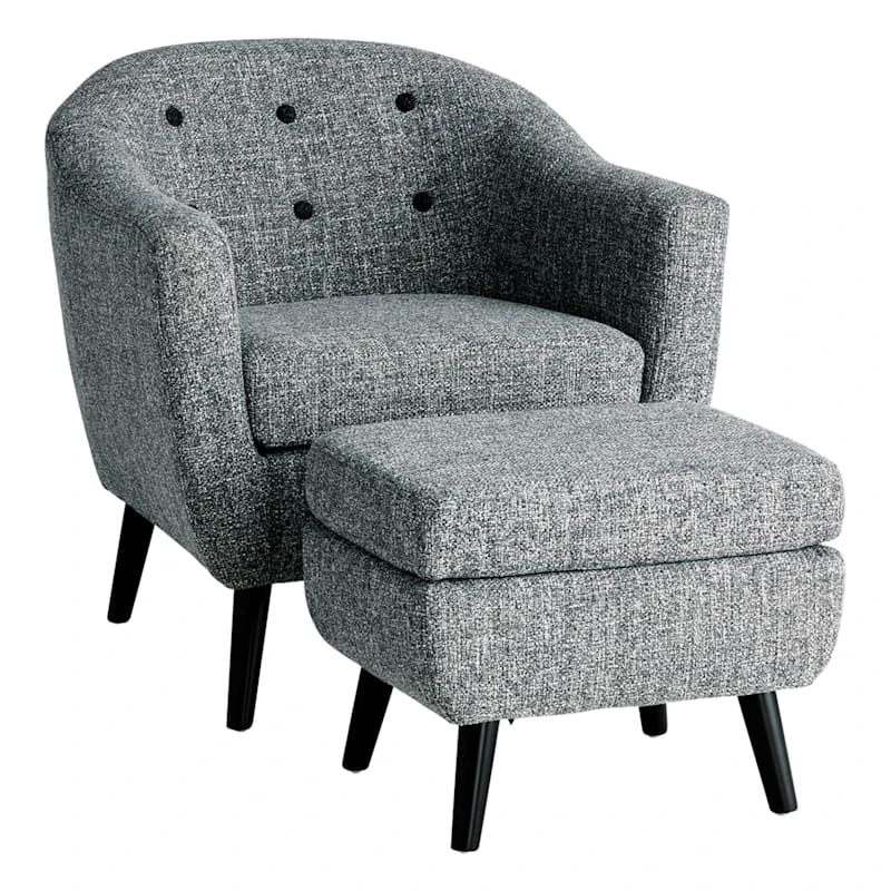 Sit back and relax in style with our combination Rockwell accent armchair and ottoman set boasting modern flair. Each piece features a sturdy solid and manufactured wood frame and stands upon four lightly stained wooden legs for superb durability and stability. This comforting barrel style structure is upholstered in comfortable, textured polyester fabric in a modern salt and pepper hue that elevates the minimalist aesthetic. Button tufting around the back adds a nice touch of designer personality. Flexible in its use, this group is an ideal combo for any small place in your living room, bedroom or anywhere you desire.