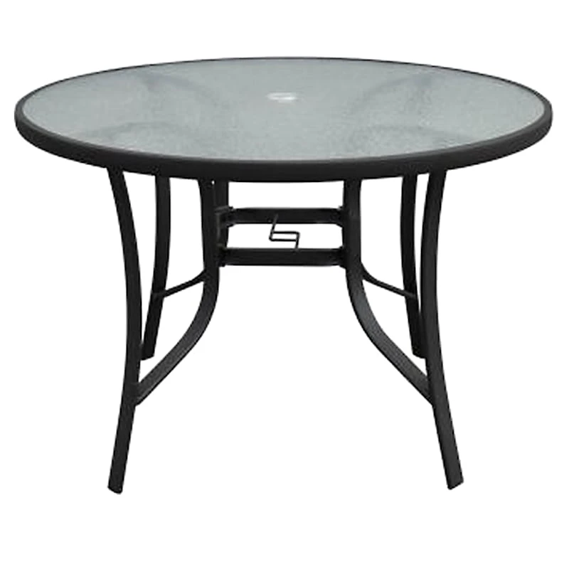 Our black steel round dining table with tempered glass top is perfect for any outdoor space, big or small. The color is neutral to complement other existing furniture collections. The simple, traditional design is exactly the right combination for your deck, porch or somewhere in the garden. Sit down and enjoy a relaxing cocktail or have a quiet meal outside.