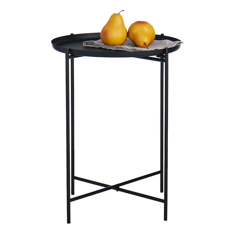 Whether you’re putting fun little trinkets on display or accenting your well-traveled living room, our understated and stylish round accent tray table is sure to make any d�cor even more interesting. Made from steel in a black finish, this side table brings a bit of global appeal to any look, while straight-lined legs and a tray-style top tie the table together in contemporary style. Assembly required.