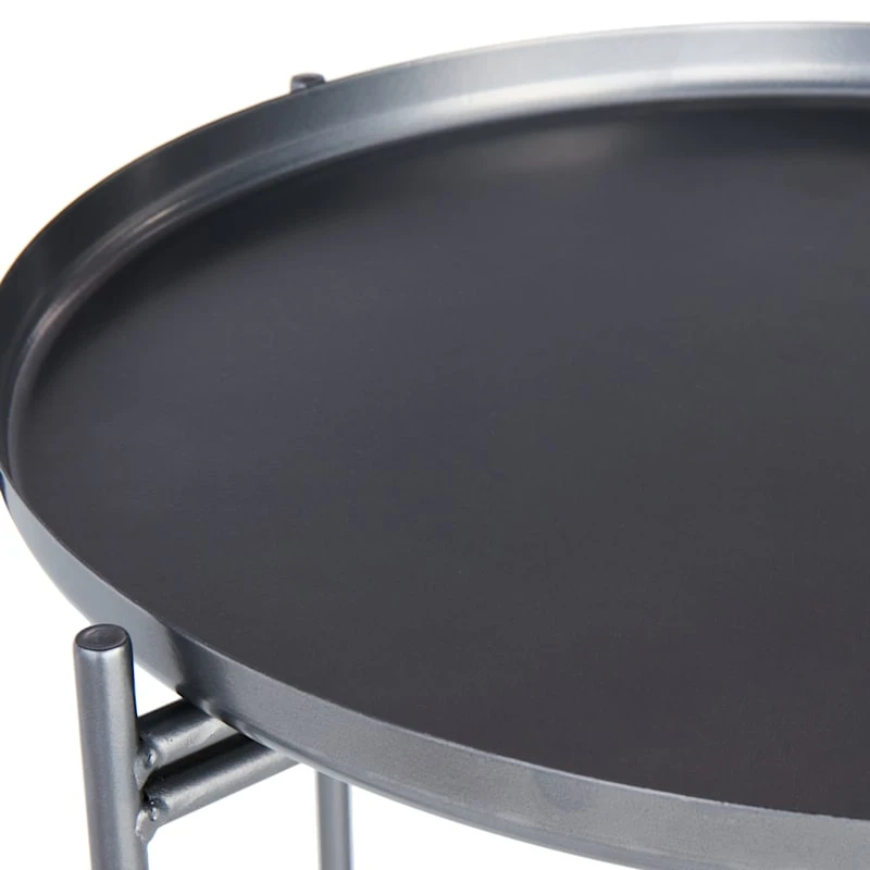 Whether you’re putting fun little trinkets on display or accenting your well-traveled living room, our understated and stylish round accent tray table is sure to make any d�cor even more interesting. Made from steel in a metallic silver finish, this side table brings a bit of global appeal to any look, while straight-lined legs and a tray-style top tie the table together in contemporary style. Assembly required.