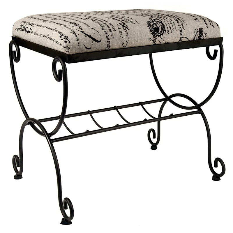 Sit and relax like European royalty upon this splendid vanity stool. The metal base features regal swirl flourishes with a lower shelf feature and the neutral fabric cushion boasts French script detailing. We think this wonderful vanity stool fits a kingdom’s worth of style in a small space.